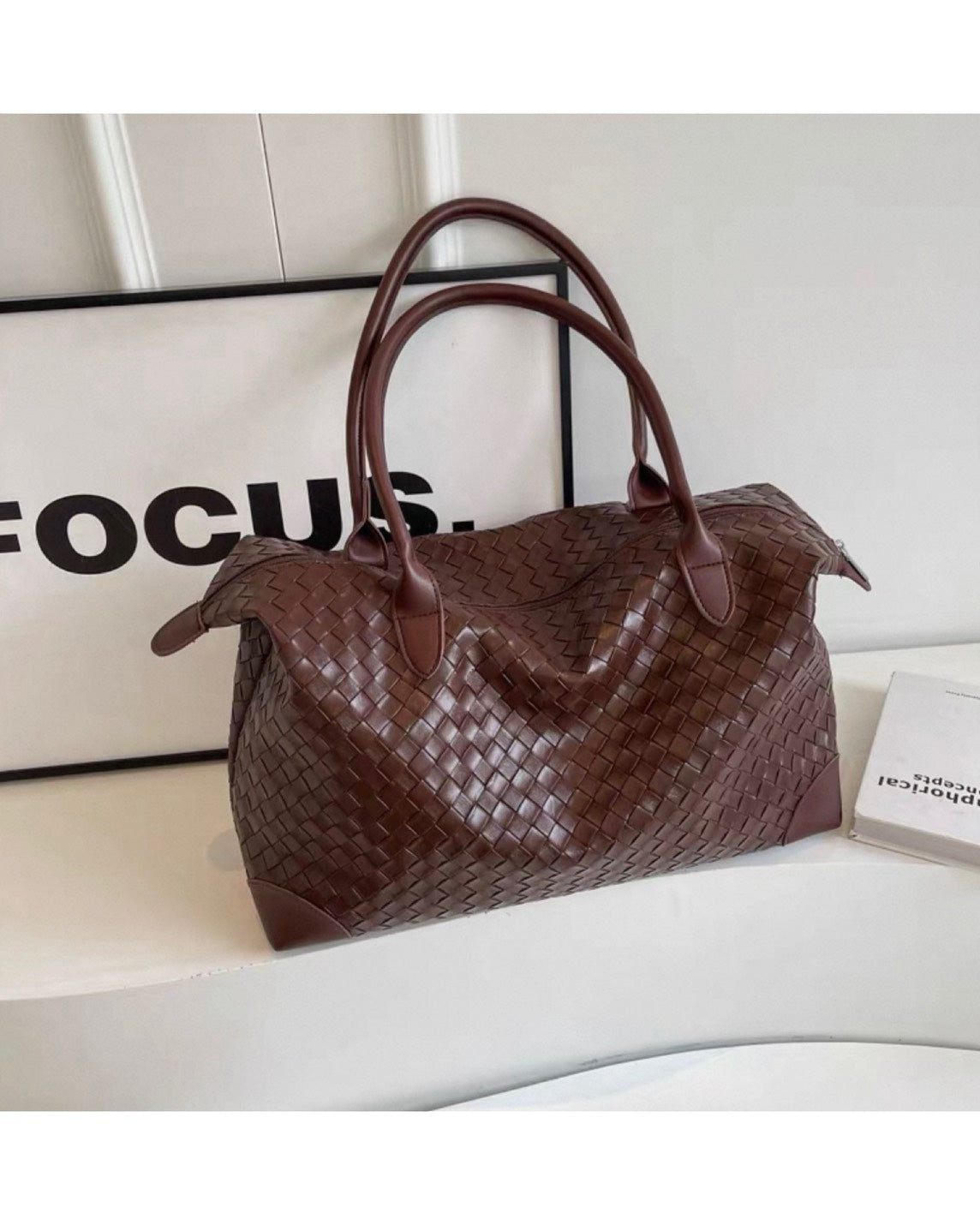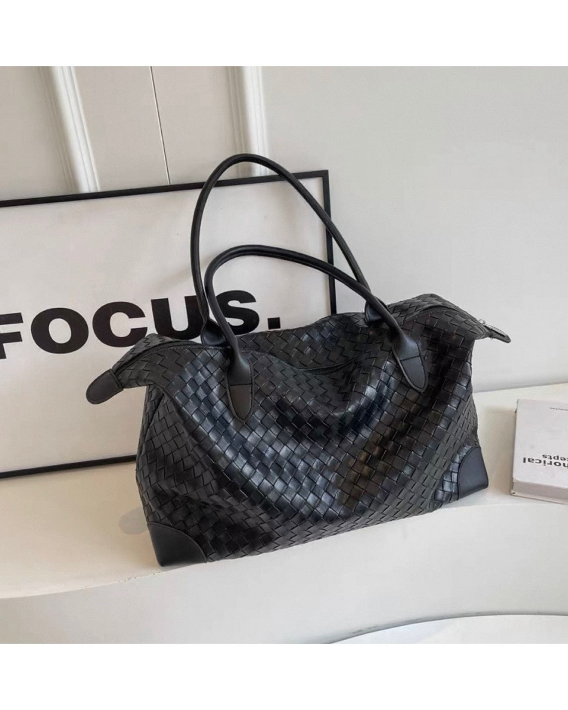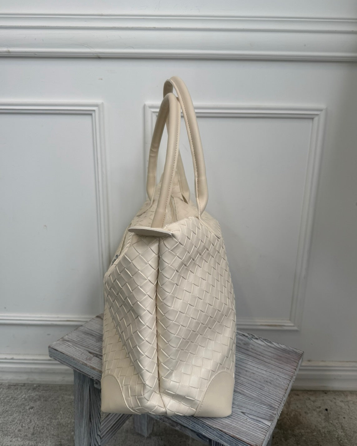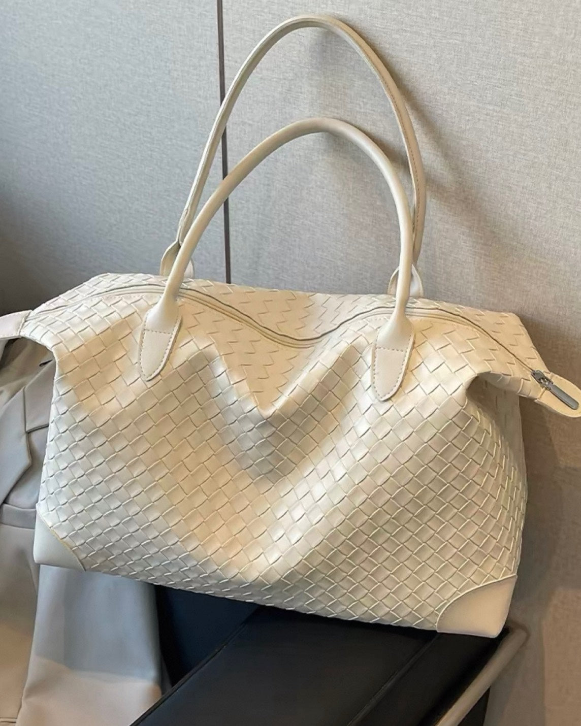 編み込みデザインが上品な存在感を放つ、イントレチャート仕様のボストントートバッグ。
