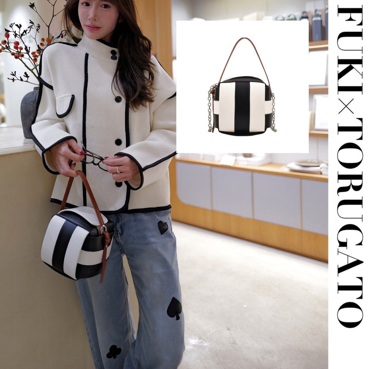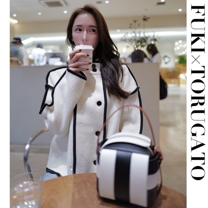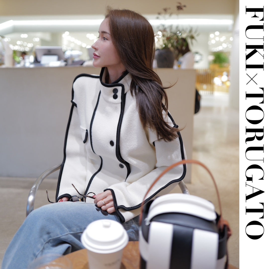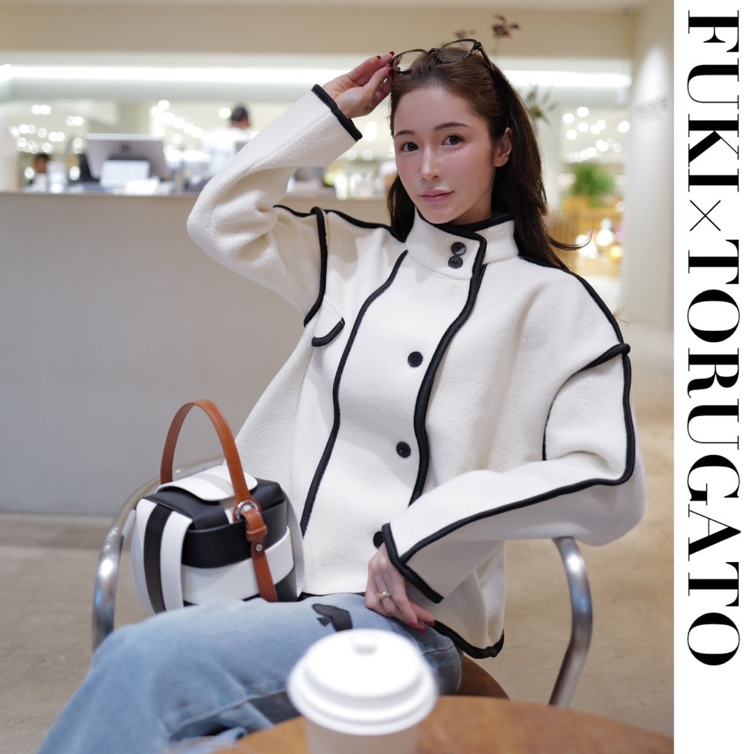 FUKIさんが着ているジャケットはパイピングバイカラージャケットです。