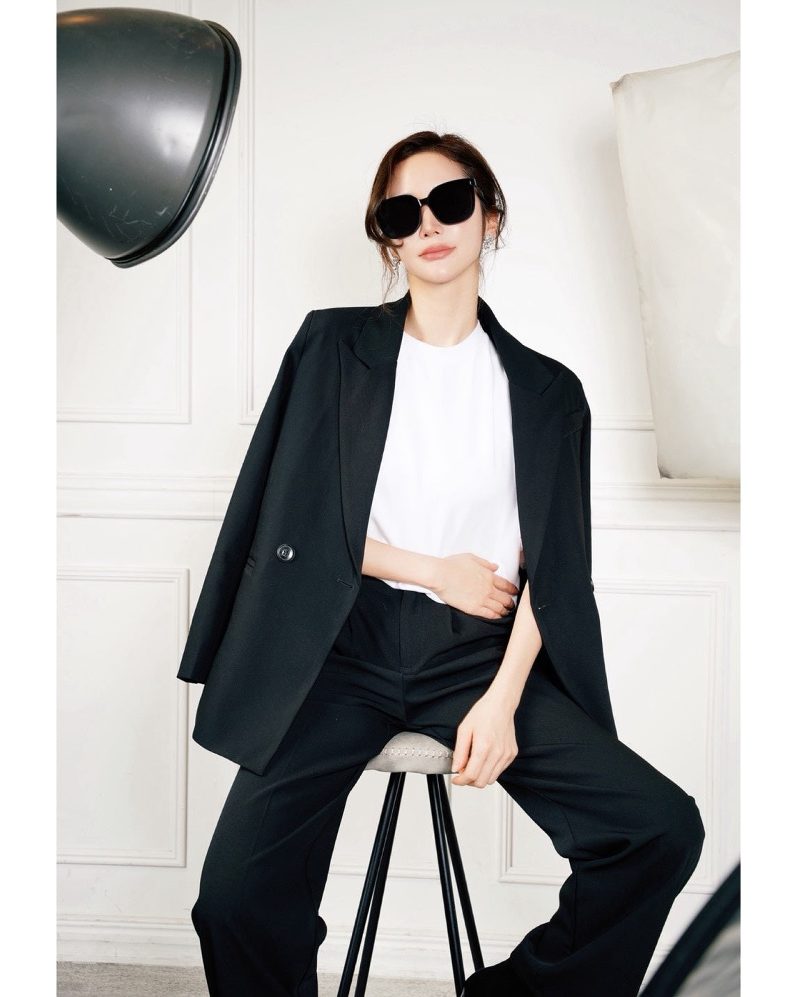 テーラードジャケットはダブルボタンでマニッシュな雰囲気を醸しつつ、程よいオーバーサイズが抜け感をプラス。
