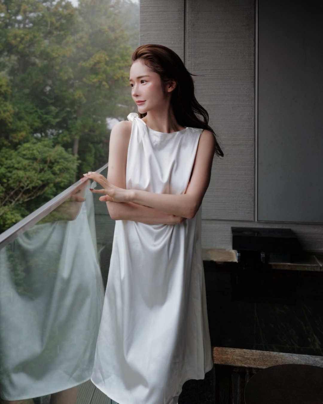 動くたびに自然に揺れるドレープシルエットが、体のラインを拾いすぎず、