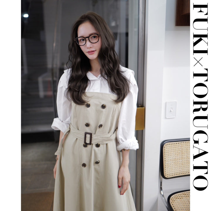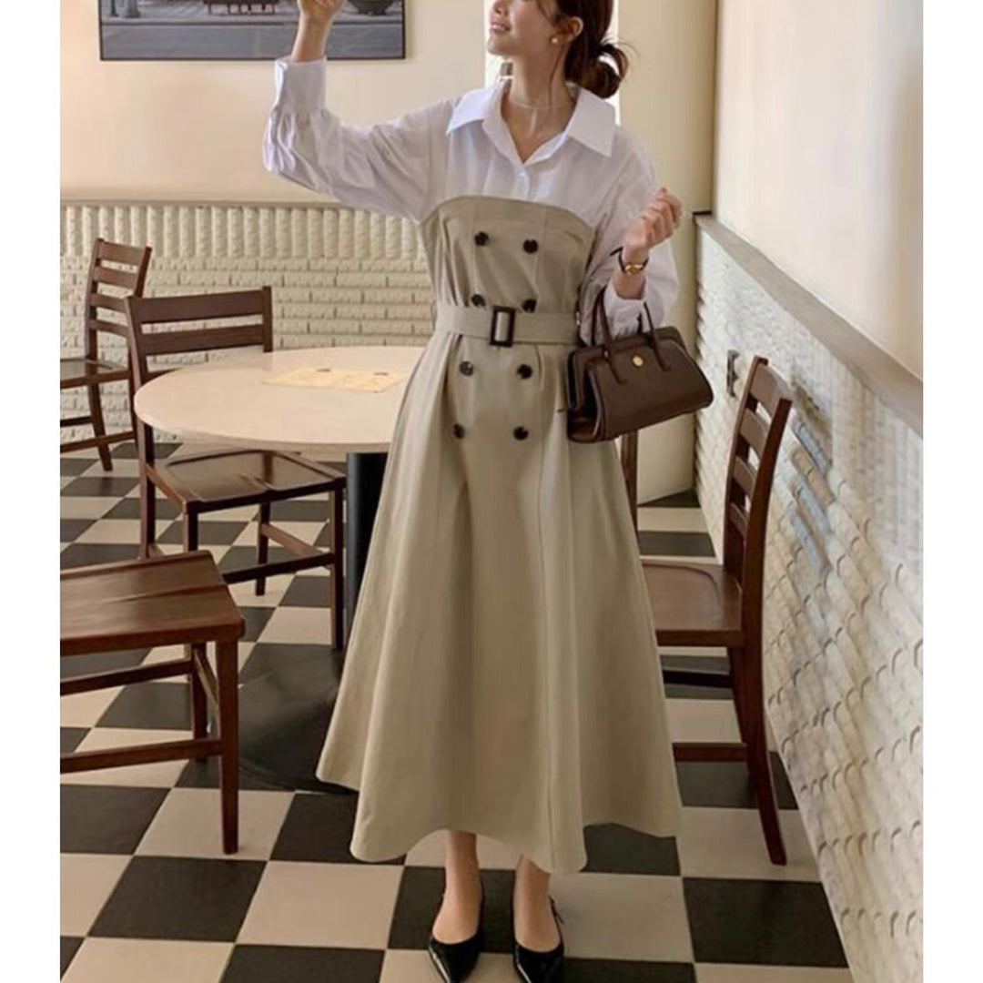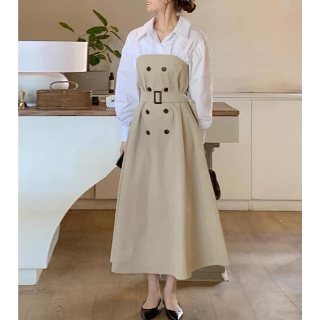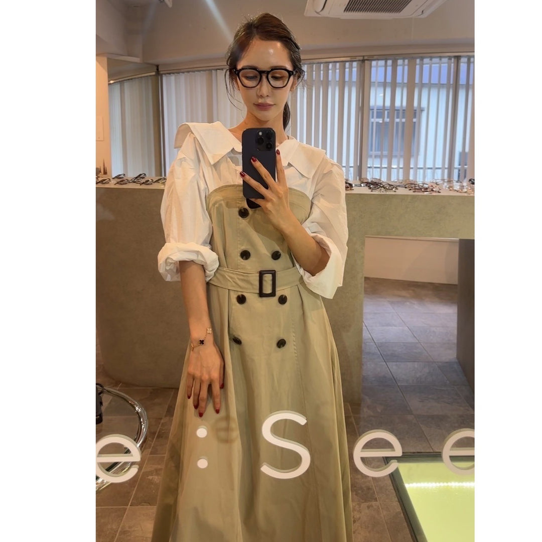 A shirt dress with a mature and calm atmosphere. It has a cutout at the chest area, so it looks like a layered dress.