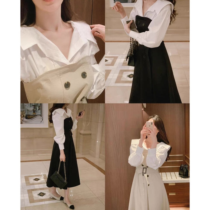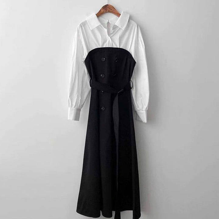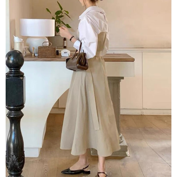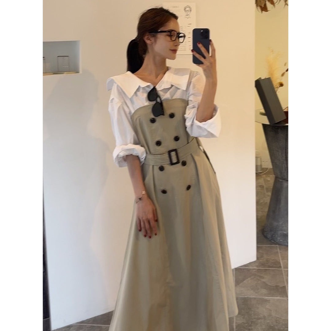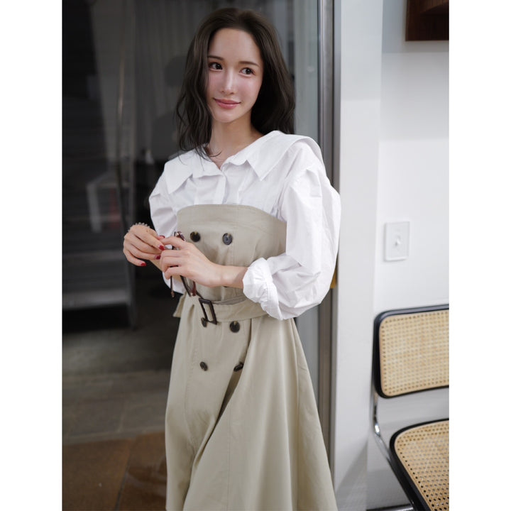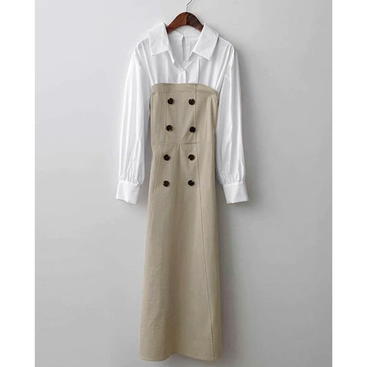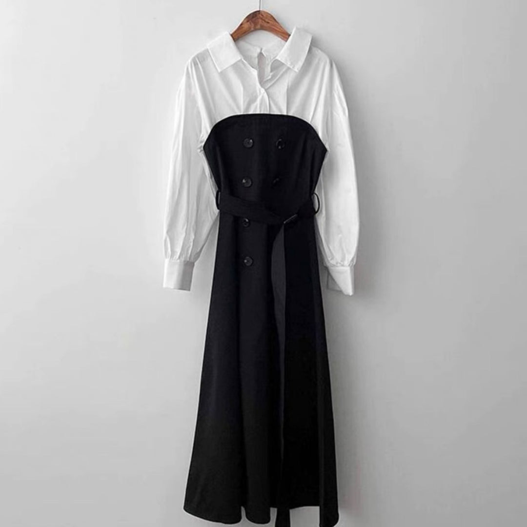 A shirt dress with a mature and calm atmosphere. It has a cutout at the chest area, so it looks like a layered dress.