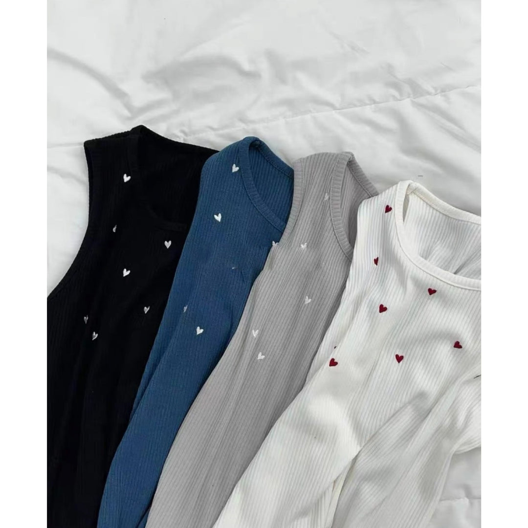 胸元にハートプリントを乗せたタンクトップ。