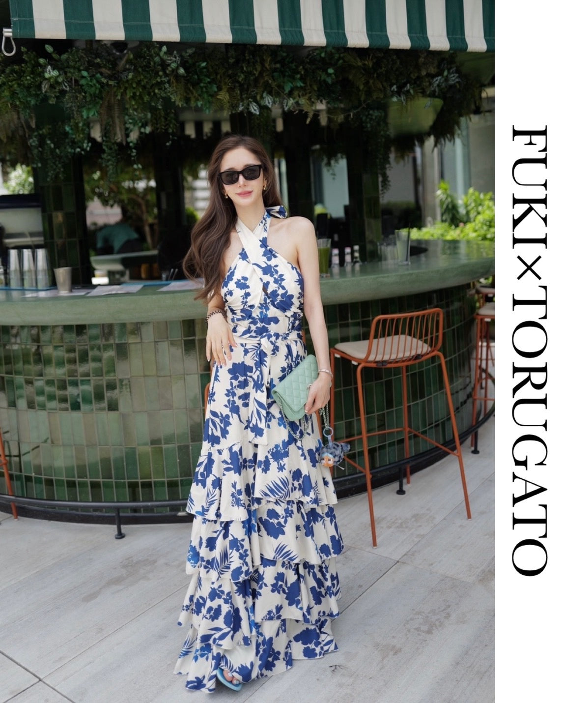 爽やかなブルーのフラワープリントが目を惹く、リゾート感たっぷりのホルターネックマキシワンピース。