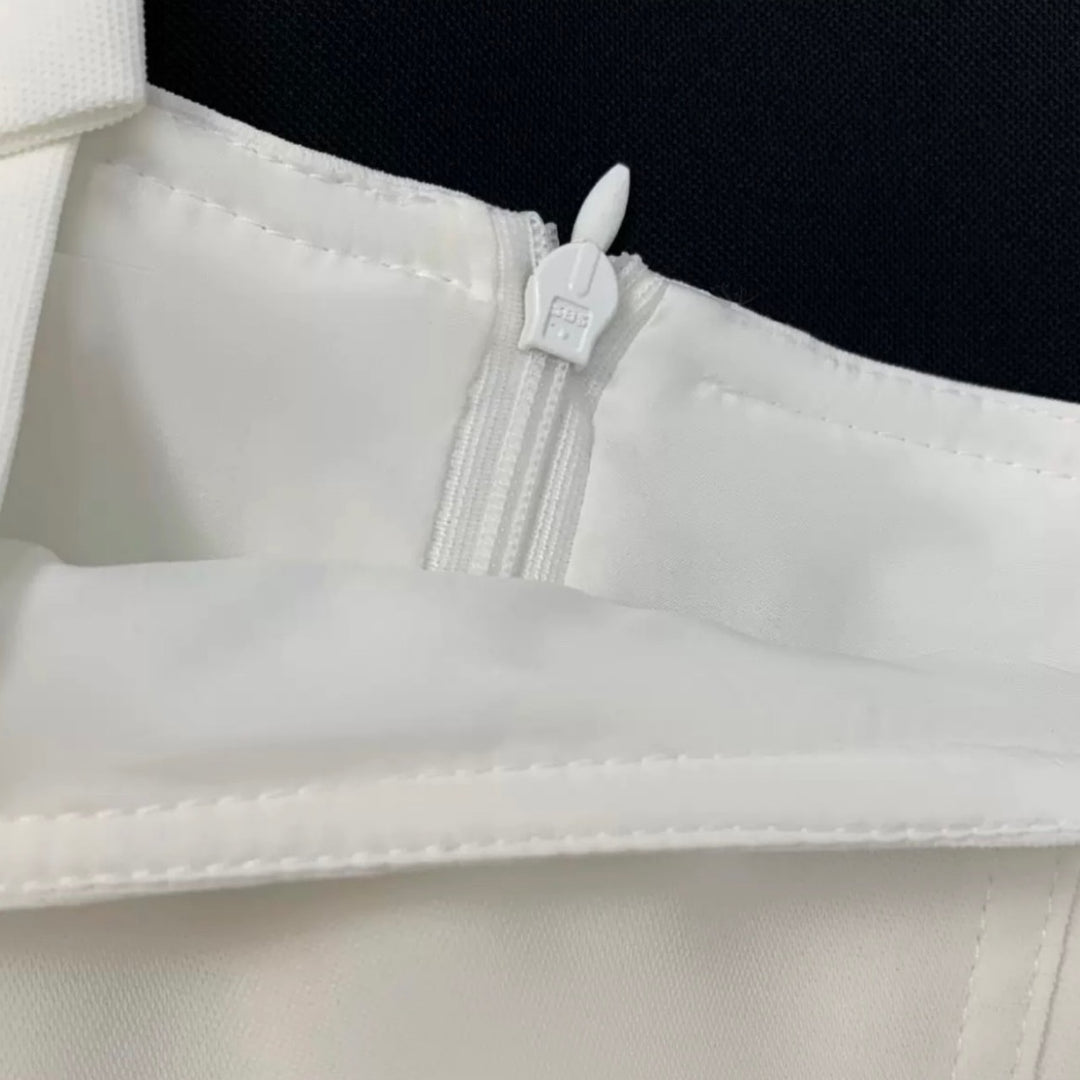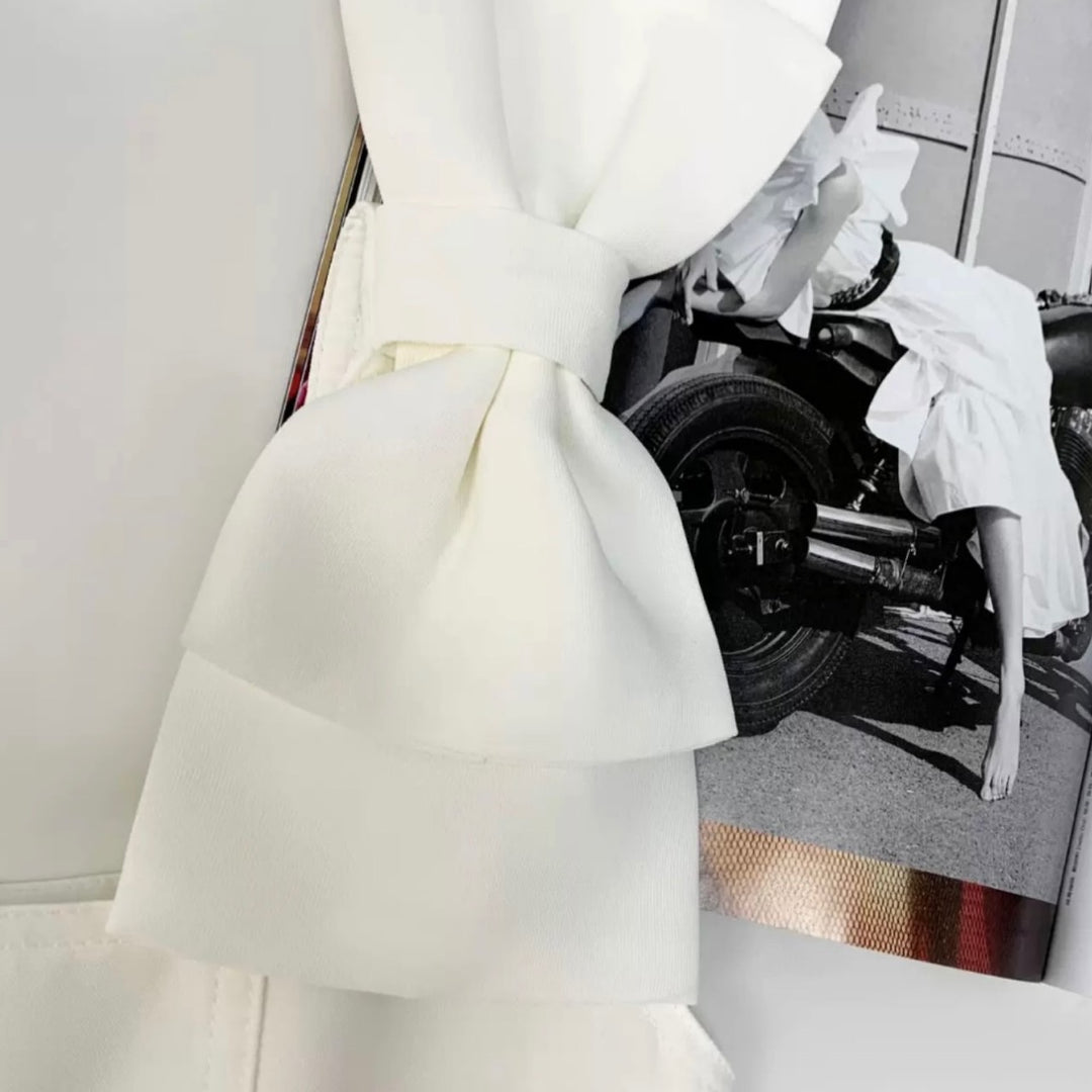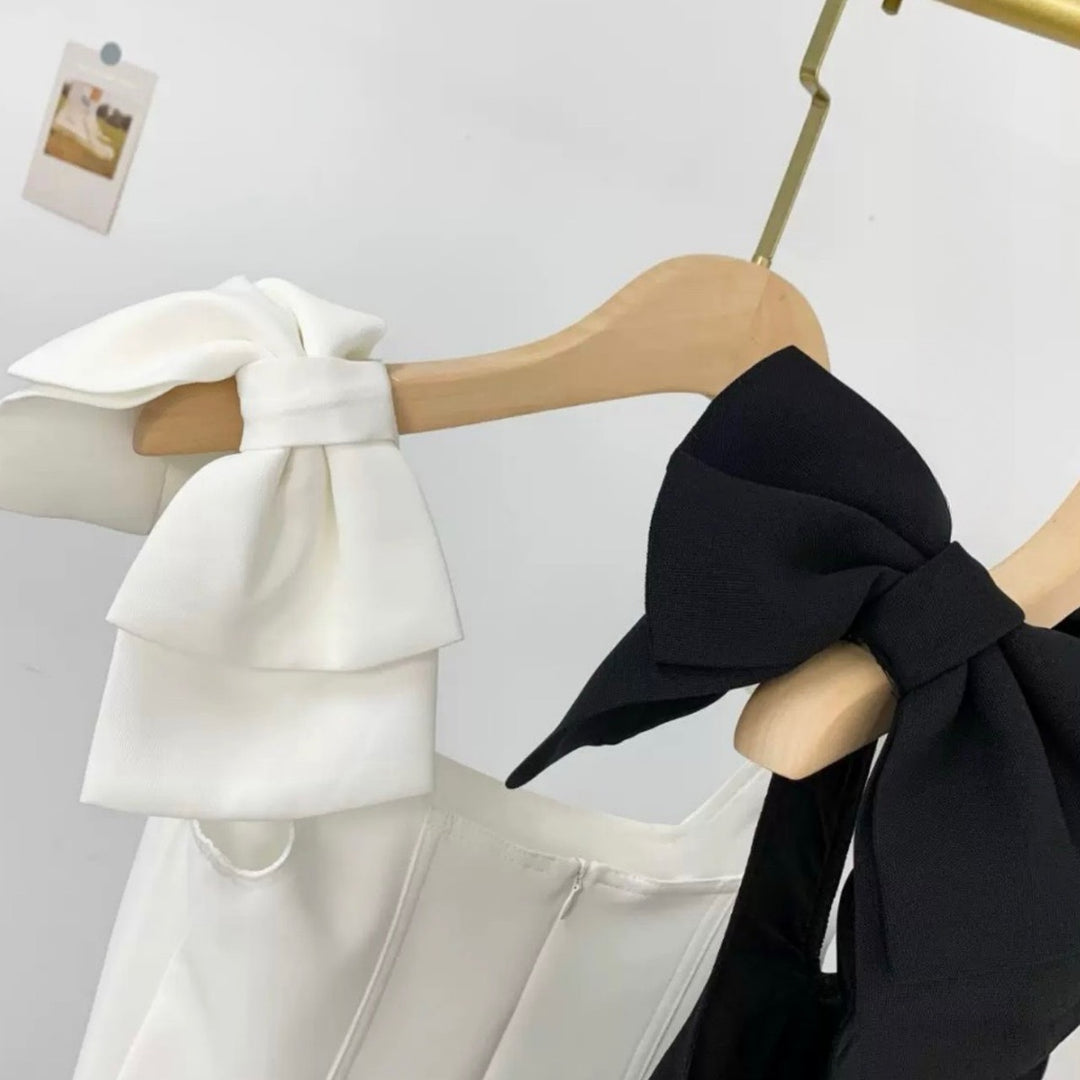 両肩にリボンが施された大人可愛いタイト目ワンピース。