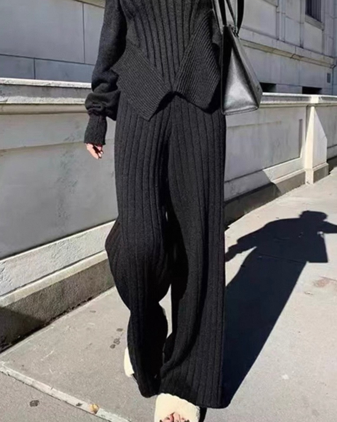 脚をすっと長く、美しく見せてくれるニットパンツ。