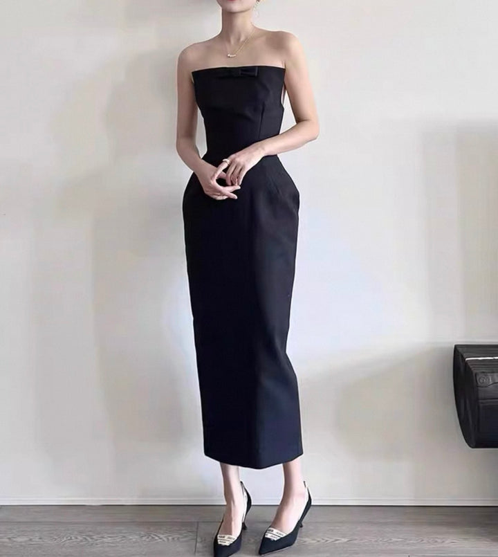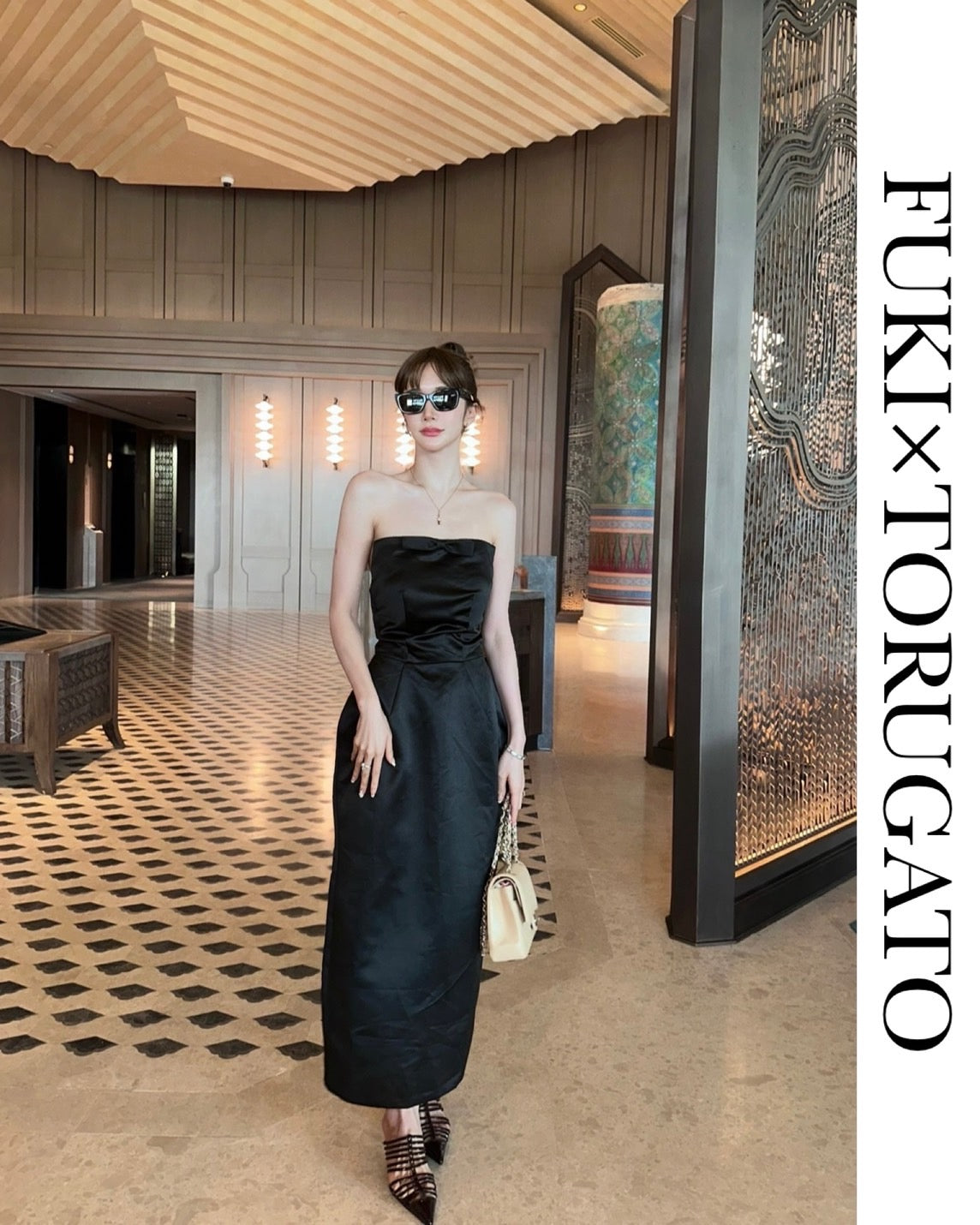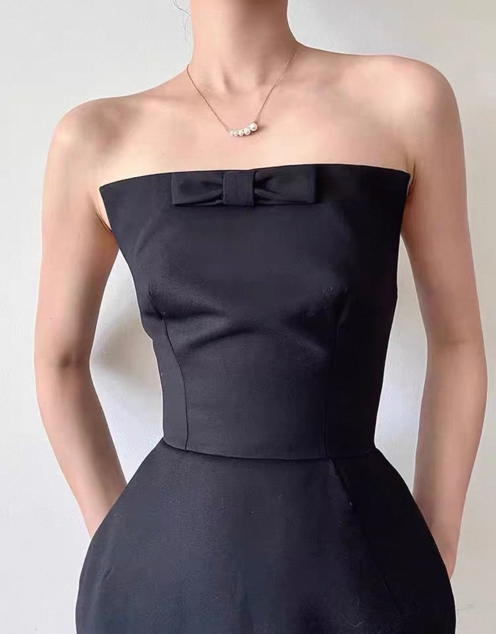上品な光沢を放つ上質なサテン素材が、洗練された大人の魅力を引き立てるチューブトップリボンワンピース。