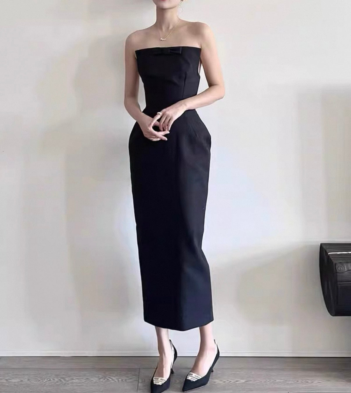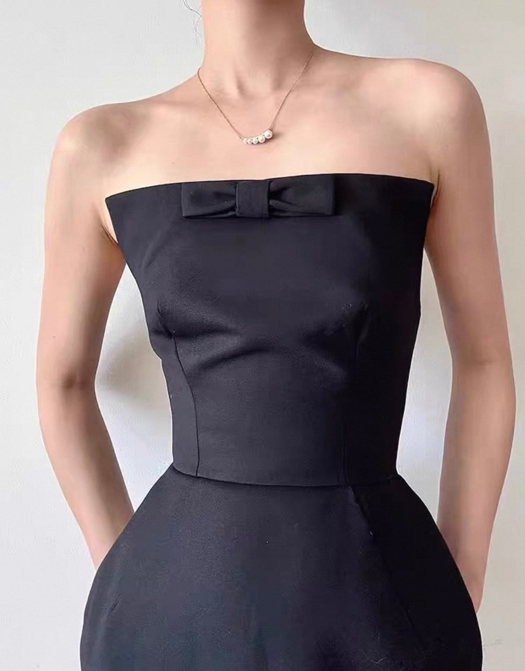 デコルテを美しく魅せるストレートビスチェの胸元には、さりげないワンポイントのリボンが添えられ、控えめながらもフェミニンな印象をプラス。
