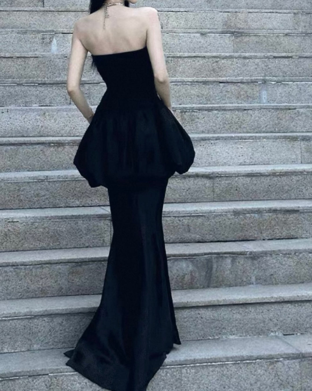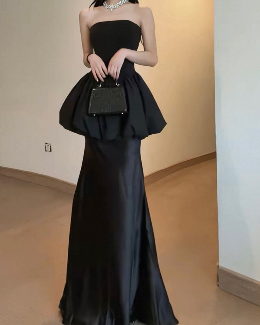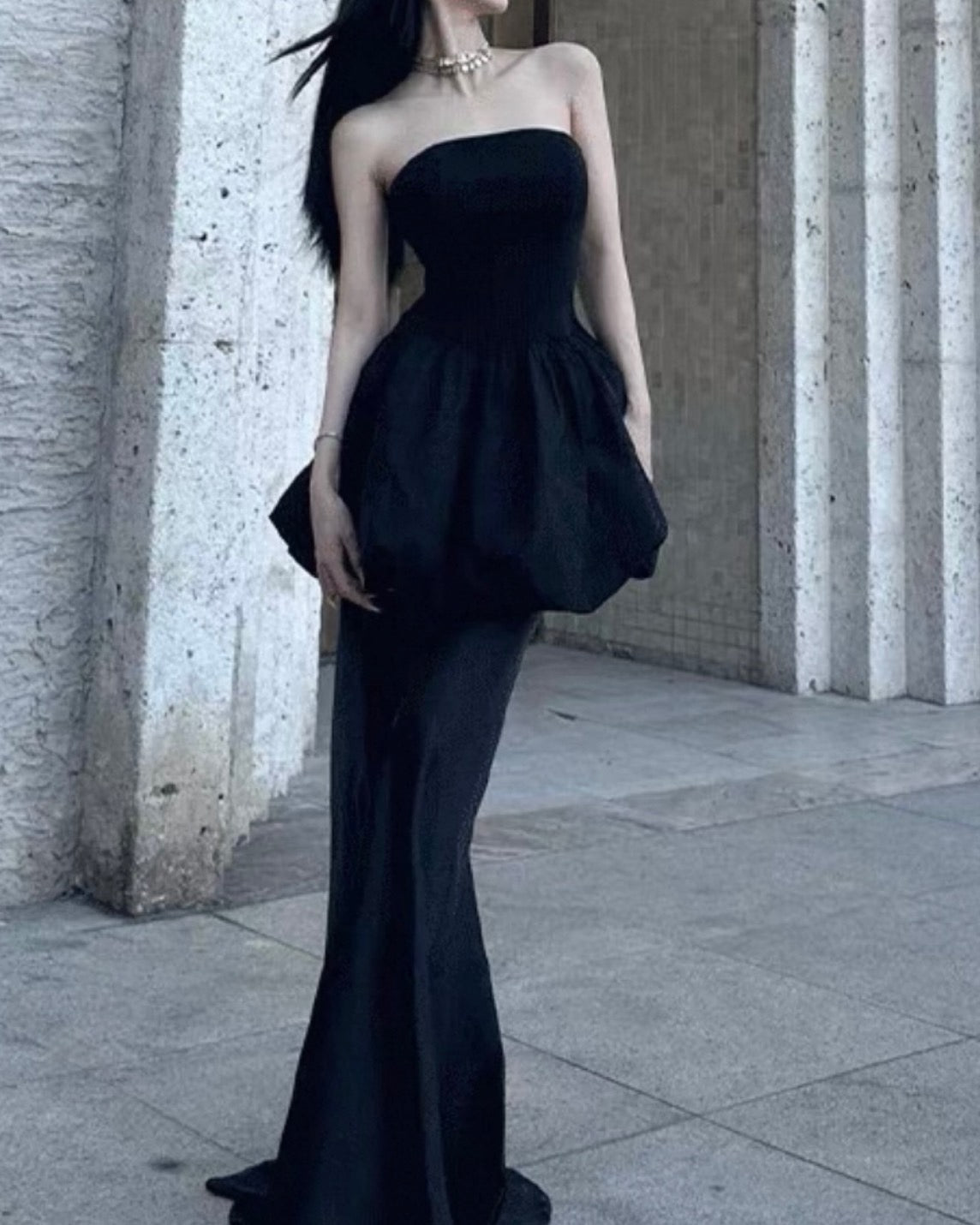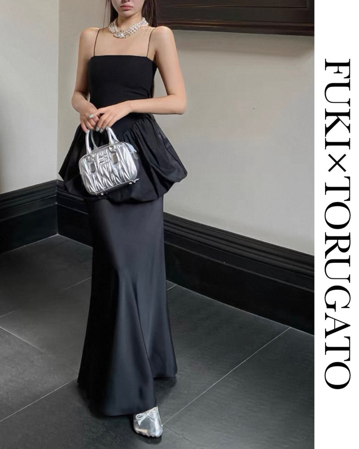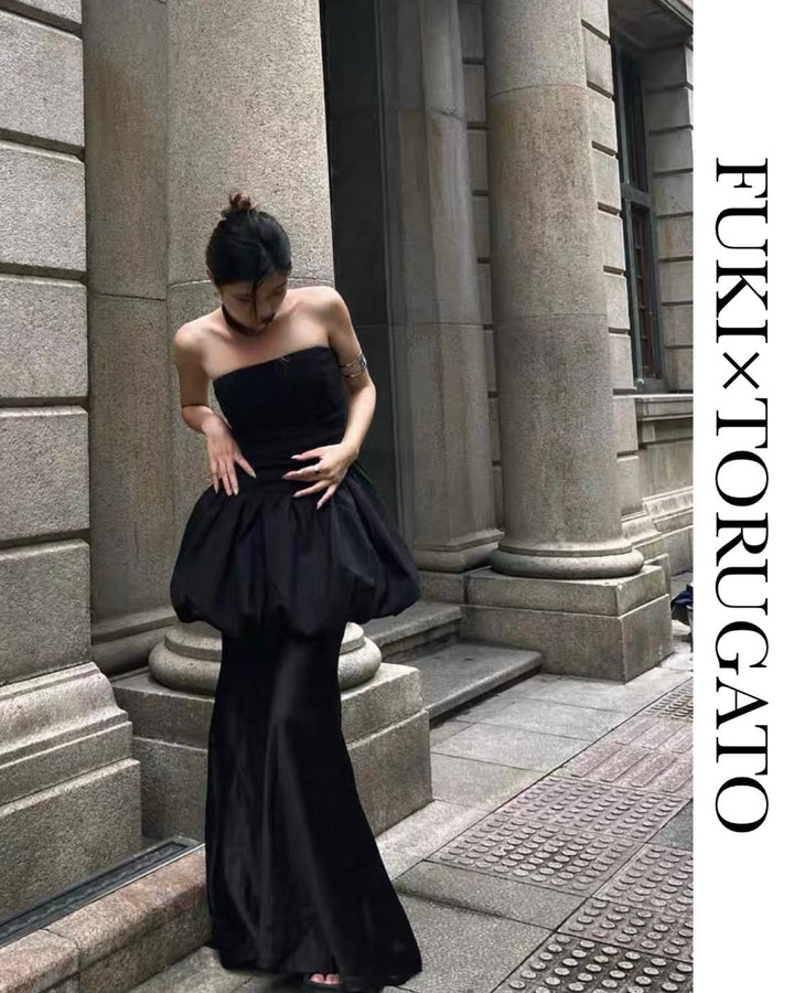 上半身はタイトなチューブトップシルエットで女性らしいラインを強調し、スカートは広がる立体的なフレアが腰回りを華奢に見せてくれます。