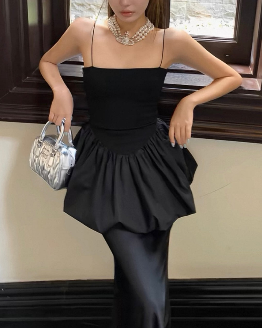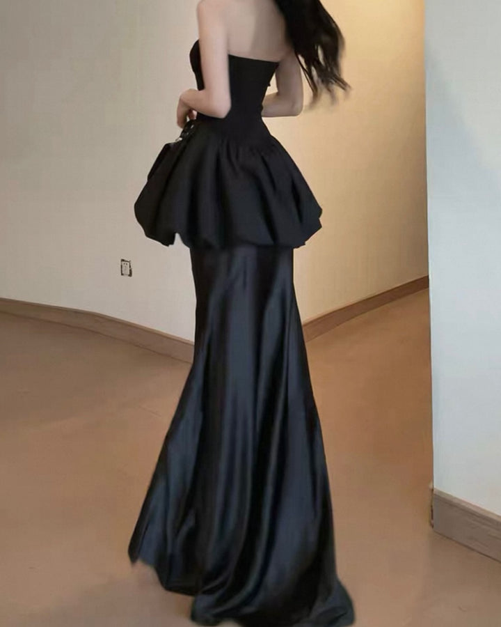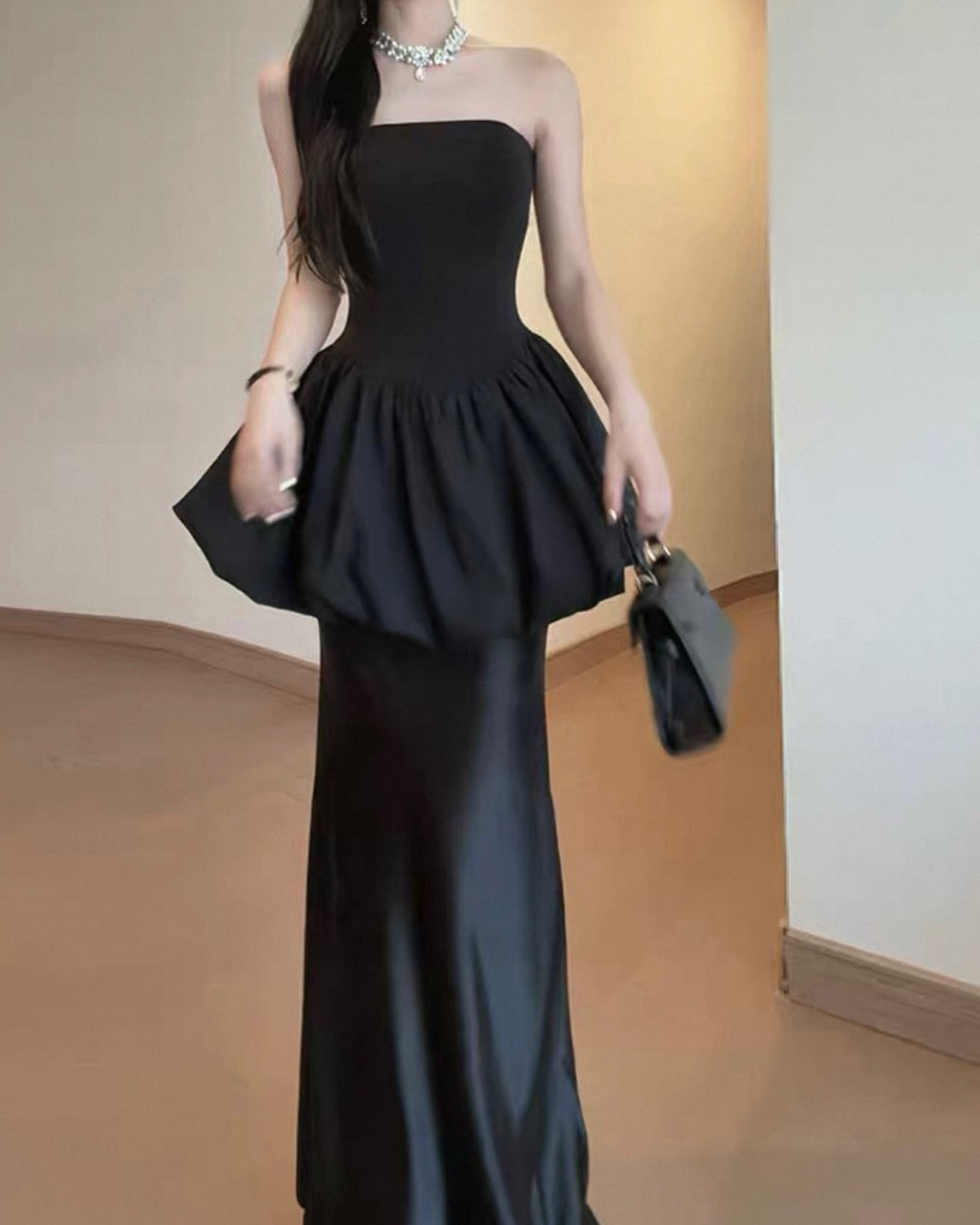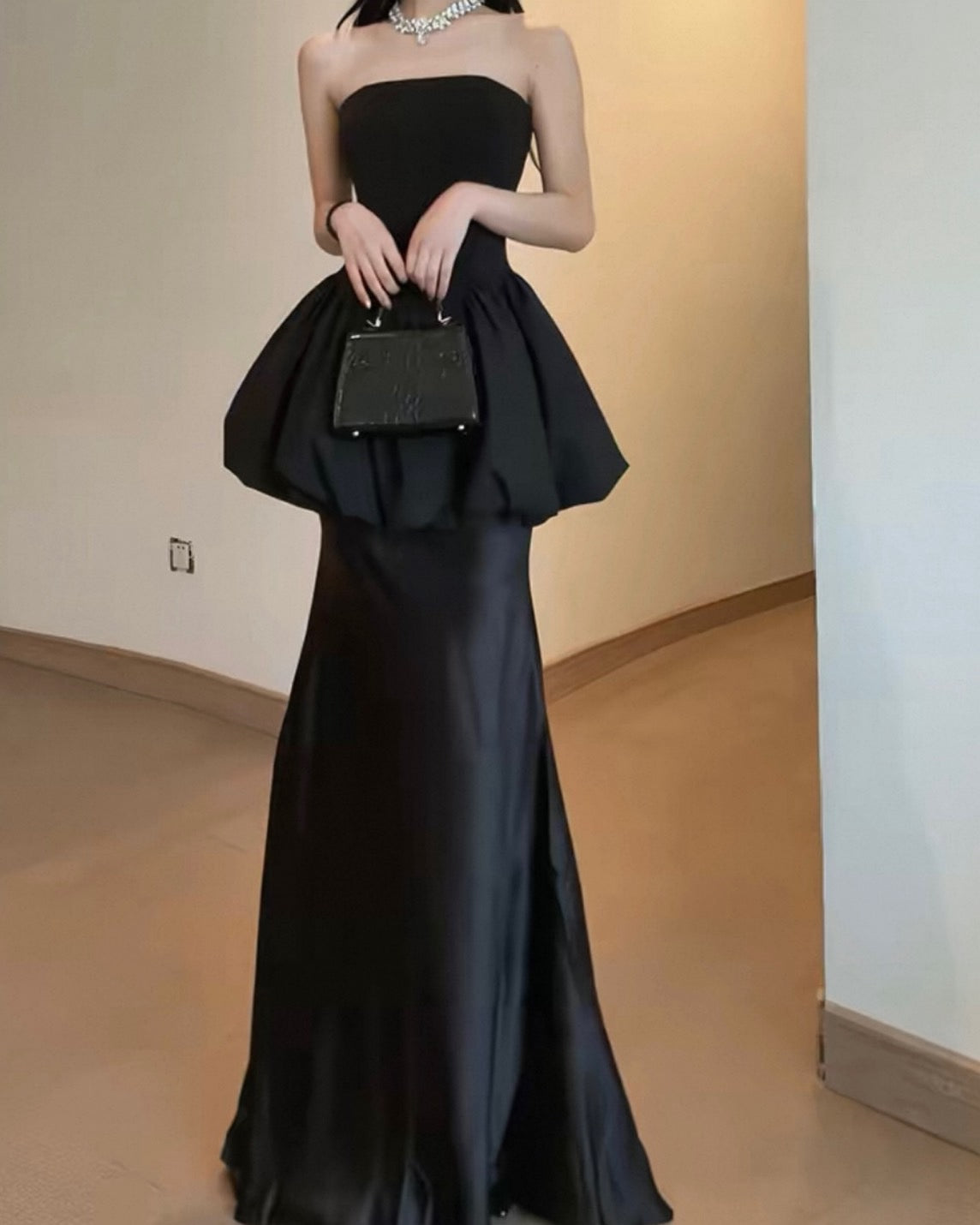 上半身はタイトなチューブトップシルエットで女性らしいラインを強調し、スカートは広がる立体的なフレアが腰回りを華奢に見せてくれます。